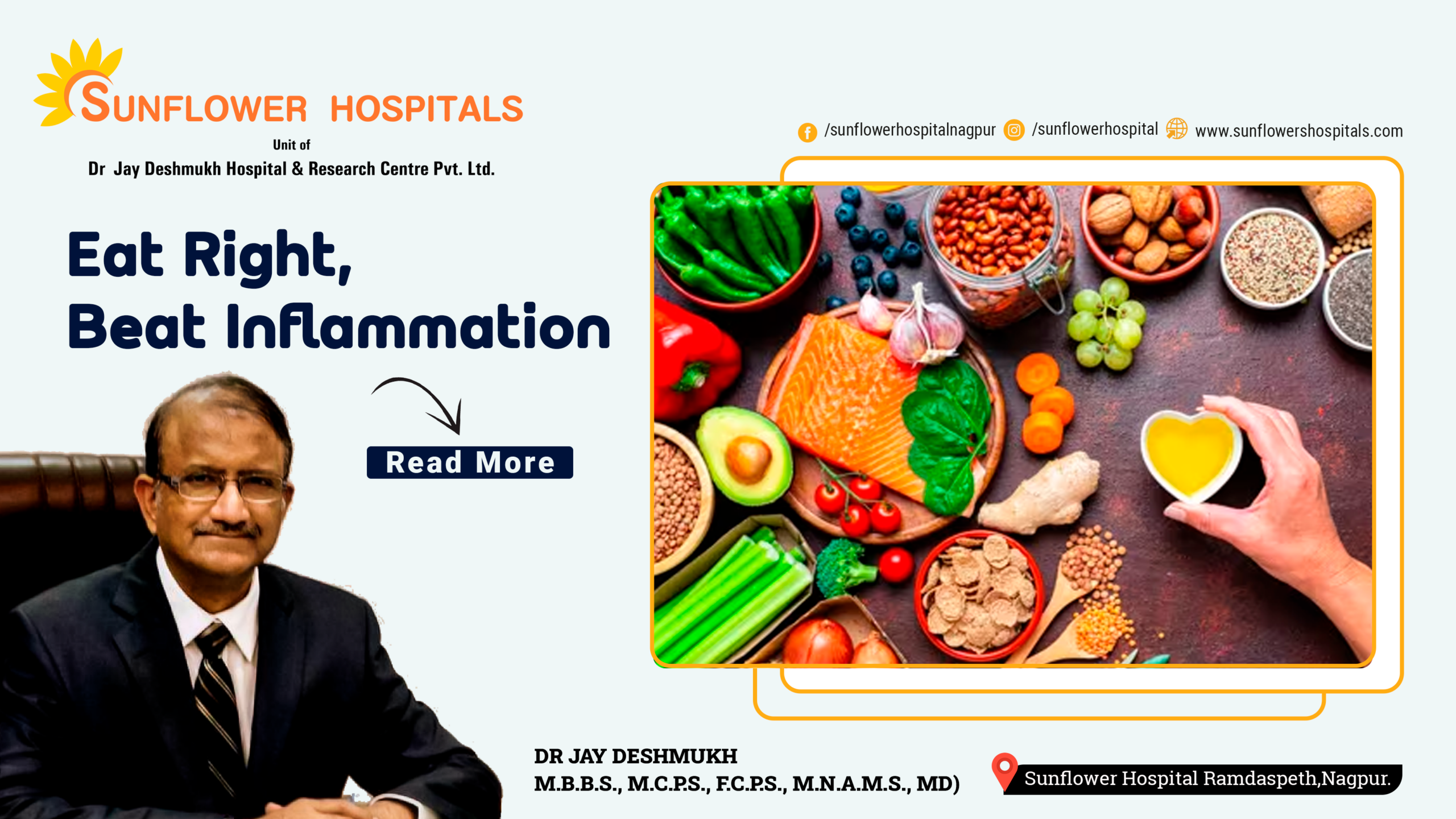 Dr Jay Deshmukh is Chief Physician and Director, Sunflower Hospital, Nagpur Honorary Physician to Honorable Governor of Maharashtra and PondicherryCentral. Dr Jay Deshmukh is an M.B.B.S., M.C.P.S., F.C.P.S., M.N.A.M.S., MD From Internal Medicine – Bombay and New Delhi.